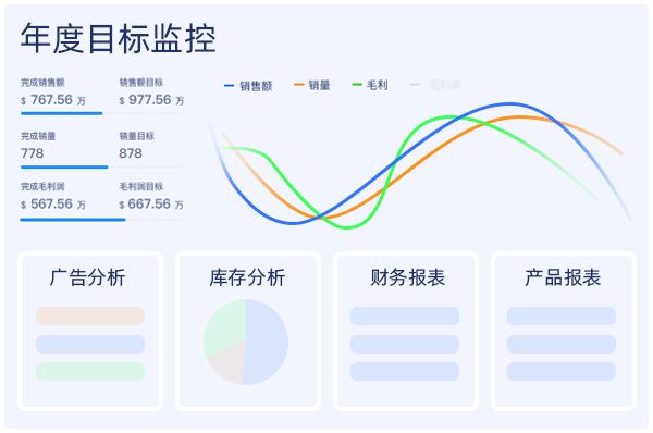 对接亚马逊、TikTok、TEMU等多平台官方数据,将平台销售、库存、本地仓、在途、库存周转情况等数据一屏整合辅助分析决策,有效把控产品ROI、库存和毛利